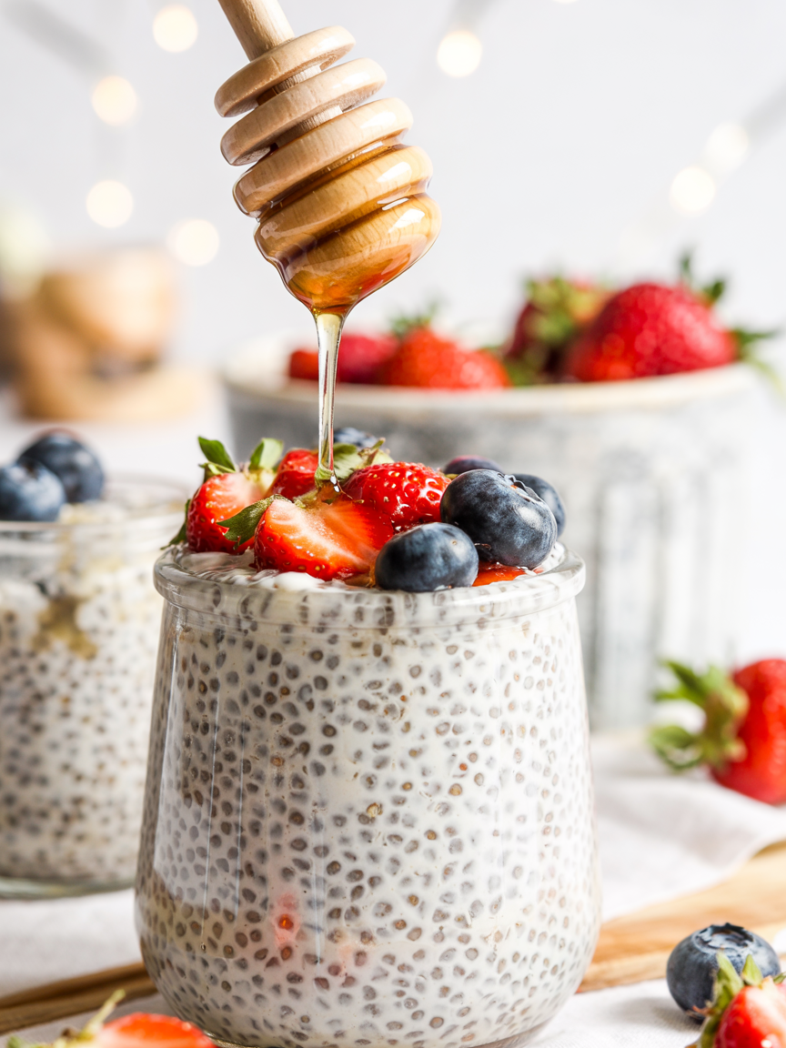 Chia seed pudding is perfect for meal prep because it lasts up to five days in the fridge. Store it in individual jars or airtight containers, add toppings when ready to eat, and grab one on your way out the door. If you’re prepping for several days, keep toppings separate to maintain freshness and crunch.